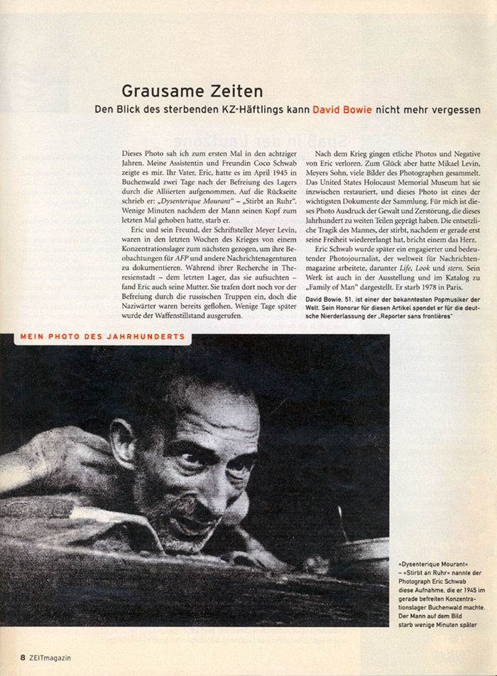 In his article "Grausame Zeiten", published in the German ZEITmagazin, popstar David Bowie wrote about his "photograph of the century": The picture Dysenterique Mourant by Eric Schwab.